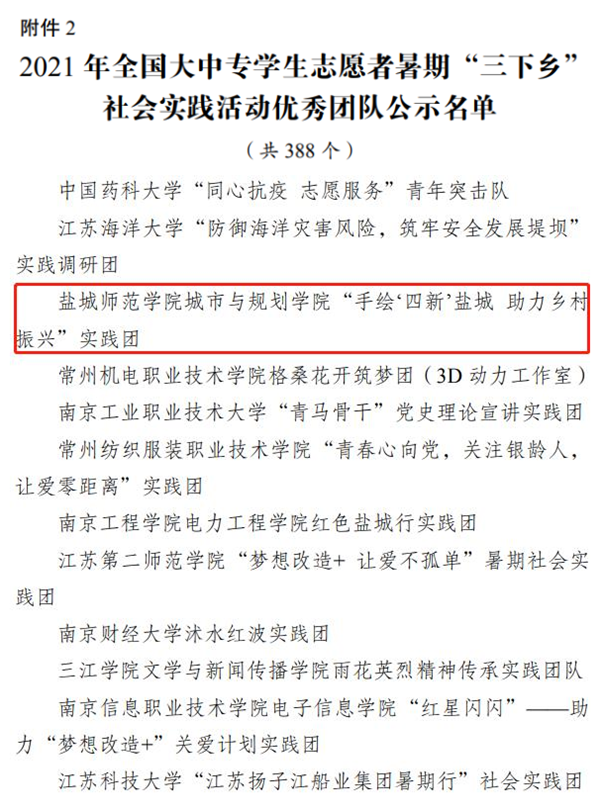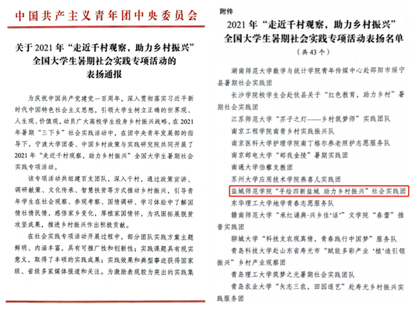 近日,团中央陆续公布了2021年度社会实践活动评比和表彰结果,我校城市与规划学院“手绘四新盐城 助力乡村振兴”实践团获2021年全国大中专学生志愿者暑期“三下乡”社会实践活动优秀团队,该实践团还被团中央2021年“走近千村观察,助力乡村振兴”全国大学生暑期社会实践专项活动通报表扬;《苏北产业转型赋能乡村振兴实践探究——以徐州市和盐城市6个村为例》获2021年全国“三下乡”“返家乡”社会实践优秀调研报告。
