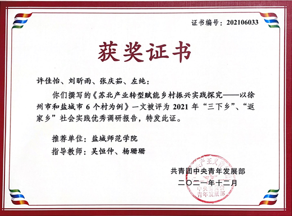 《苏北产业转型赋能乡村振兴实践探究——以徐州市和盐城市6个村为例》调研报告由产业振兴实践团小分队深入徐州沙庄村、盐城龙冈果林场等6个典型产业转型村调研之后撰写。调研报告运用ArcGIS、CAD、SPSS等软件,围绕产业转型背景、产业发展现状进行实地调研,综合分析苏北地区产业转型发展过程中面临的困境和可放大的优势,对其未来产业高质量发展提出可行性规划建议,并力求探寻苏北乡村产业转型发展的基本规律。实践团的另一调研项目《建设生态宜居美丽乡村、共绘乡村振兴宏伟蓝图》入选盐城市“三下乡”暑期社会实践重点调研课题,2名成员获盐城市暑期社会实践优秀实习生,1名成员的“返家乡”社会实践故事“探究产业转型 助力乡村振兴”被中青校园报道。学院暑期社会实践活动被《人民日报》《中国青年报》、中青网、交汇点、江苏教育发布等多家中央、省、市媒体专题报道。