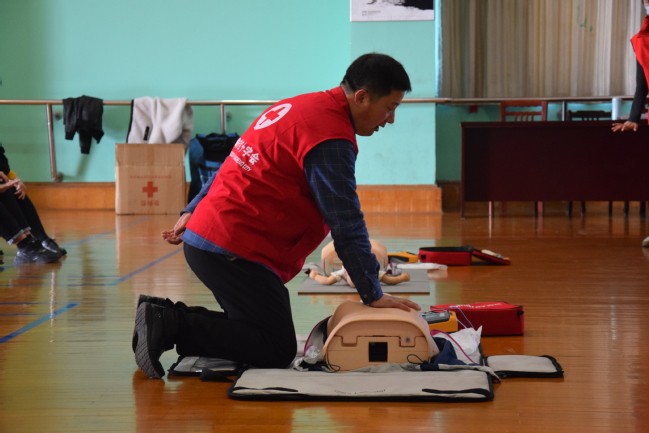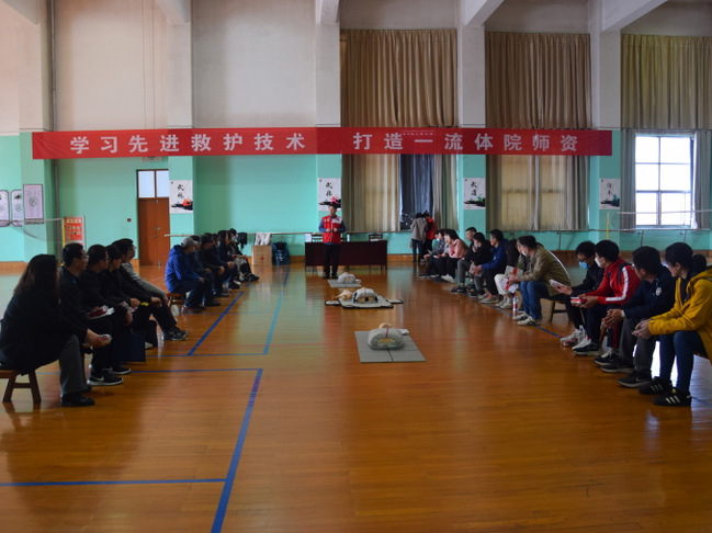 培训活动结合体育学院实际,围绕心肺复苏、创伤救护、常见急诊现场处理等急救知识与技能进行培训。培训中,荣钟祥利用人体模型现场实地演示,手把手教学,面对面授课。培训师还向每位到场师生发放救护手册、救护包等用品。参训师生逐一练习之后进行了现场考核,培训师生均获得了红十字会颁发的救护员证。