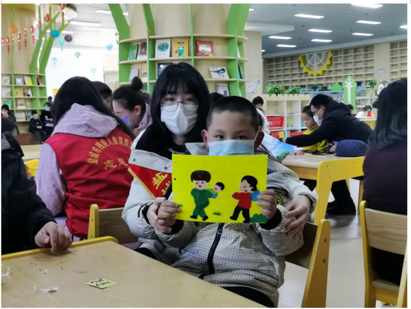 活动过程中,志愿者与老师们耐心地与孩子们交流,共同阅读图书馆精美绘本,听孩子们热情地表达,志愿者还为孩子们送上玩偶、文具、零食等事先精心准备好的伴手礼,志愿者与孩子们举着共同完成的画作合影留念。