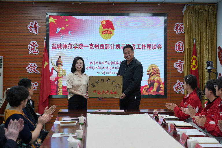 会议现场,双方共同为“盐城师范学院大学生社会实践基地”签约并揭牌。与会领导向西部计划志愿者发放满载着母校关怀与期望的慰问品,并为他们颁发“西部计划联络员”聘书。