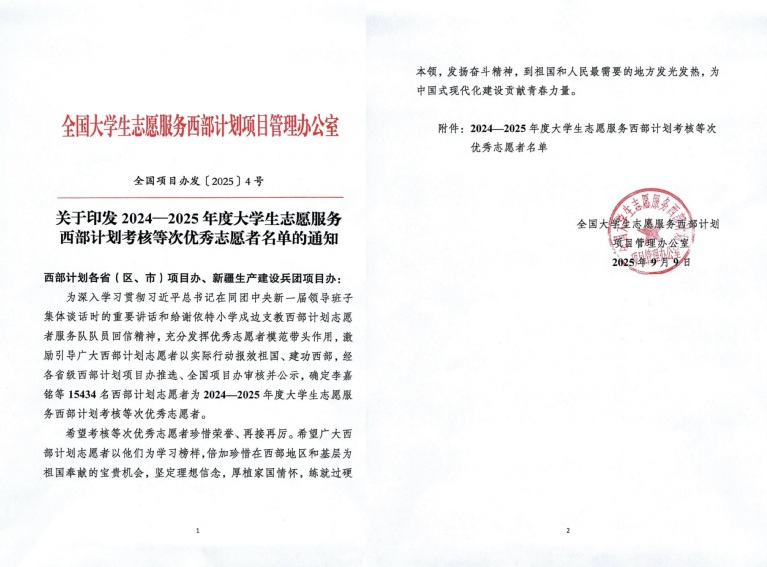 近日,全国大学生志愿服务西部计划项目管理办公室发布《关于印发2024—2025年度大学生志愿服务西部计划考核等次优秀志愿者名单的通知》。我校12位学子凭借在基层岗位上的扎实表现与突出成绩,成功入选西部计划考核等次优秀志愿者名单。